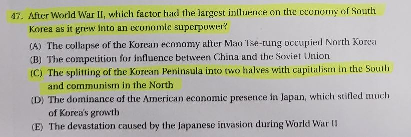 선택지 (C)는 모순적입니다. 1970년대 초반까지만 해도 북한이 경제적으로 우월했습니다. 한반도 분단 이후의 경제 체제 선택이 남한으로 하여금 경제 대국으로 발전하게 되었다는 이유를 충분히 제공하지 못합니다.