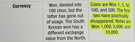 “1, 5, 50, 100, 500원 동전을 사용한다. 1원, 5원 동전은 실질적으로 사라졌다. 1,000, 5,000, 10,000원 지폐를 사용한다.”