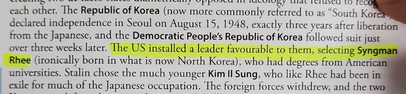 The US installed a South Korean leader favourable to them, selecting Syngman Rhee (ironically, born in what is now North Korea), who had degrees from American universities.