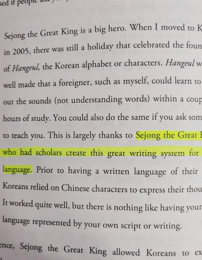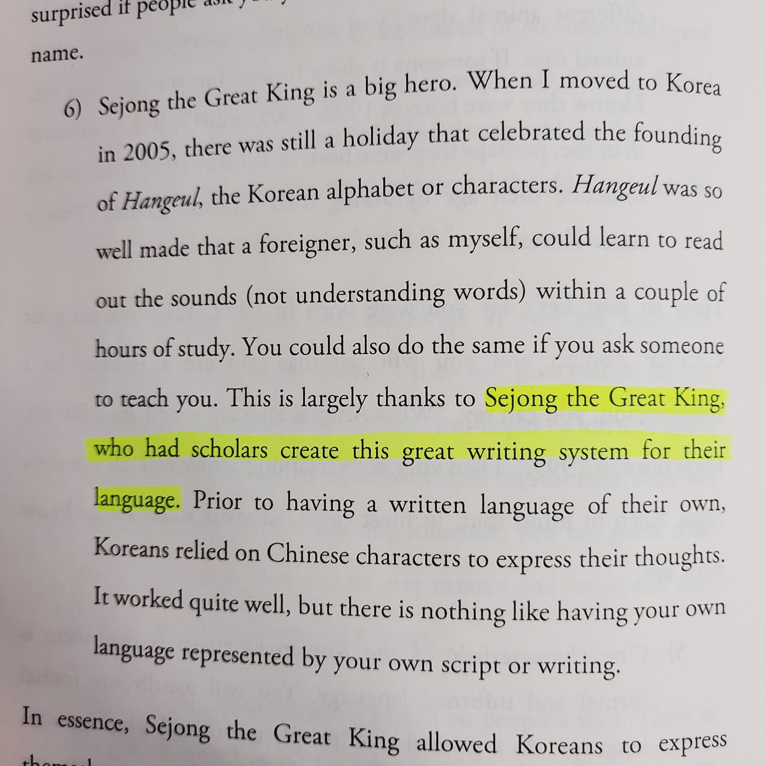 한글은 저와 같은 외국인이 두어 시간 공부하면 소리(단어를 이해하는 것이 아니라) 읽는 법을 배울 수 있을 정도로 잘 만들어졌습니다. 다른 한국인에게 가르쳐 달라고 요청하면 당신도 똑같이 배울 수 있습니다. 이는 학자들로 하여금 그들의 언어에 대한 이 훌륭한 문자 체계를 만들게 한 세종대왕 덕분입니다.