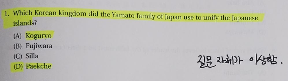 Q. 1. 일본의 야마토 가문이 일본 열도를 통일하기 위해 이용한 한국의 왕국은? … A. (D) 백제 [p.137]