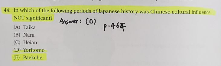Q. 44. In which of the following periods of Japanese History was Chinese cultural influence NOT significant? … A. (D) Yoritomo / Choice (E) Paekche(Baekje) [p.446]