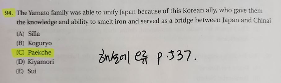 Q. 94. The Yamato family was able to unify Japan because of this Korean ally, who gave them the knowledge and ability to smelt iron and served as a bridge between Japan and China? … A. (C) Paekche(Baekje) [p.528]