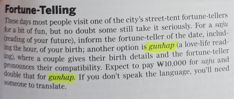 Tags | gunghap | Korea Guidebook | Korea Travel Guide | Korean Culture | Korean Fortune Telling | Lonely Planet | Lonely Planet Seoul | saju | Seoul Guidebook | Seoul Travel Guide | 궁합 | 론리플래닛 | 사주 | 서울 가이드북 | 운수 | 점 | 한국 가이드북 | 한국 문화