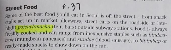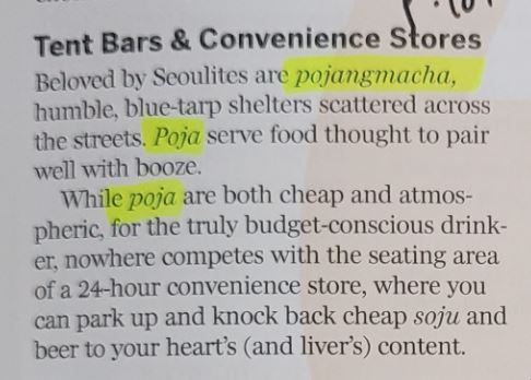 오타입니다. 포장마차는 줄여서 ‘포자(poja)’가 아니라 ‘포차(pocha)’라고 합니다. [p.37]