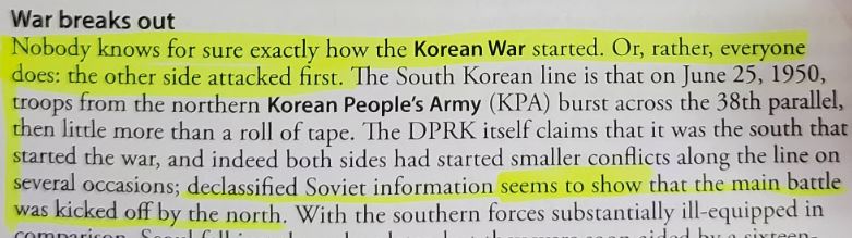 아무도 한국전쟁이 어떻게 시작되었는지 정확히 알지 못합니다. 아니면 모두가 알고 있다고도 할 수 있습니다: 한 상대방이 다른 상대방을 공격했습니다. … 기밀 해제된 소련 정보는 주요 전투가 북한에 의해 시작되었음을 보여주는 것 같습니다.