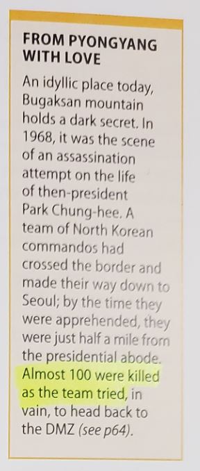 … In 1968, it was the scene of an assassination attempt on the life of then-president Park Chung-hee. … Almost 100 were killed as the team tried, in vain, to head back to the DMZ.