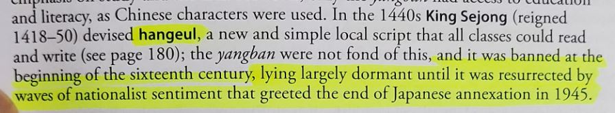 1440년대에 세종(1418-50재위)이 한글을 고안해 냈으며, … 한글은 16세기 초에 금지되었으며, 1945년 일본의 합병이 끝나는 것을 반긴 민족주의적 정서의 물결에 의해 부활 할 때까지 거의 휴면 상태에 있었다.