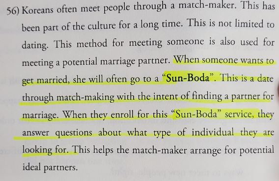 어떤 사람이 결혼을 하고 싶을 때 그(녀)는 종종 “선-보다“에 갈 것입니다. 이것은 결혼 상대를 찾는 의도로 진행되는 중매를 통한 데이트입니다. 그들이 이 “선-보다” 서비스에 등록하면, 그들은 어떤 유형의 상대방을 찾고 있는지에 대한 질문에 답합니다.