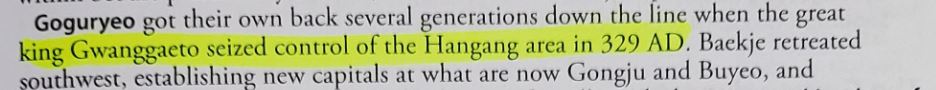 King Gwanggaeto lived from 374 to 412, and reigned from 391 to 412. It was around 396 when King Gwanggaeto seized control of the Hangang area.