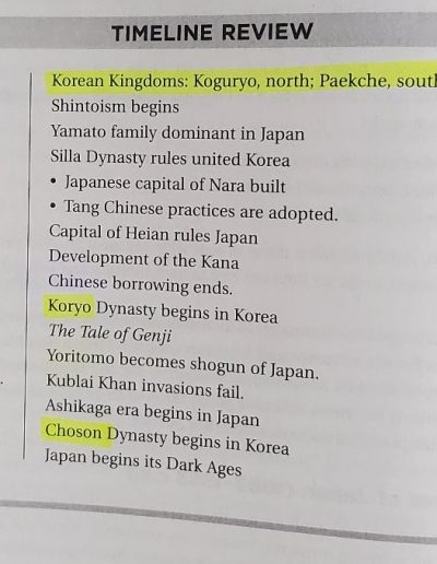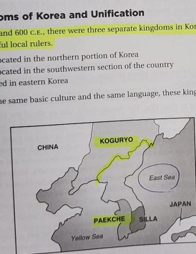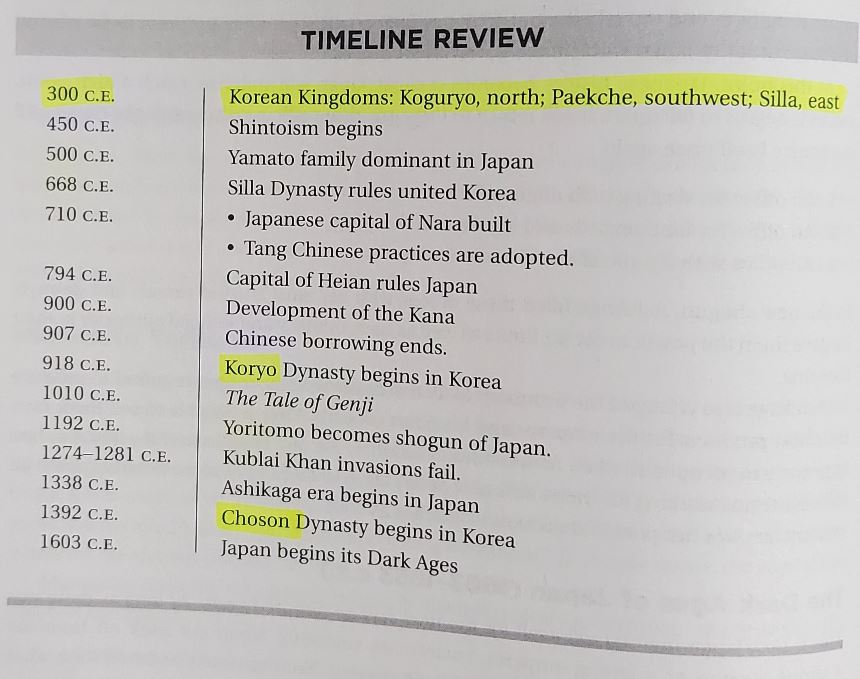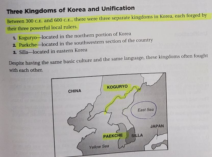 Koguryo(Goguryeo), Paekche(Baekje), and Silla all began in the 1st Century B.C., so “Between 300 C.E. and 600 C.E. ” is wrong. Goguryeo(37 B.C. ~ 668 A.D.), Baekje(18 B.C. ~ 660 A.D.), and Silla(57 B.C. ~ 935 A.D). The Three Kingdoms Era ended in 668 A.D. after Silla destroyed Goguryeo in the same year. The unification of the three kingdoms by Silla was reached in 676 A.D. and Silla lasted until 935 A.D.