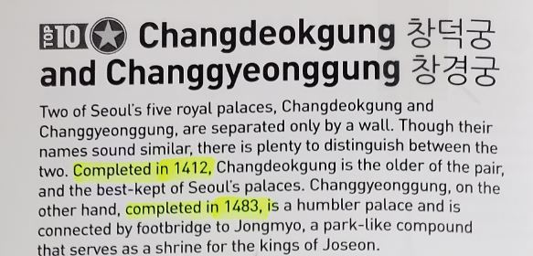 Changdeokgung was built in 1405 and its main gate Donhwamun was built in 1412.